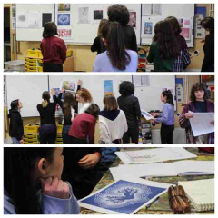 Afin de favoriser un retour réflexif sur cette expérience artistique, le professeur d’arts plastiques a proposé aux élèves de réaliser une note d’intention en quelques lignes justifiant des choix artistiques (écriture, mise en page, accrochage) en lien avec l’œuvre choisie. Les élèves devaient également réaliser un fichier audio MP3, proposant la lecture orale du travail d’écriture réalisé lors de cet atelier.