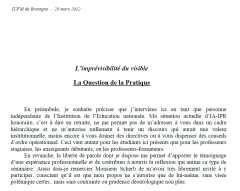En préambule, je souhaite préciser que j’interviens ici en tant que personne indépendante de l’Institution de l’Education nationale. Ma situation actuelle d’IA-IPR honoraire, c’est à dire en retraite, ne me permet pas de m’adresser à vous dans un cadre hiérarchique et ne m’autorise nullement à tenir un discours qui aurait une valeur institutionnelle, moins encore à vous donner des directives ou à vous dispenser des conseils d’ordre opérationnel. Ceci vaut autant pour les étudiants ici présents que pour les professeurs stagiaires, les enseignants débutants, ou les professeurs-formateurs.