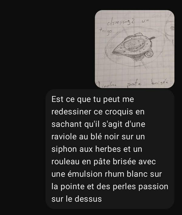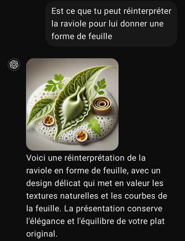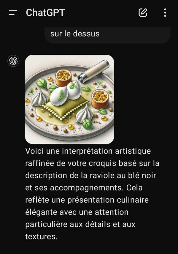 Un autre élève demande à l’IA de transposer un croquis « dessiné main » en une image augmentée. Le plat fusion est une raviole et l’élève souhaite que l’IA l’aide sur le visuel final. Les captures d’écran ci-dessous permettent de comprendre l’interaction élève/machine.