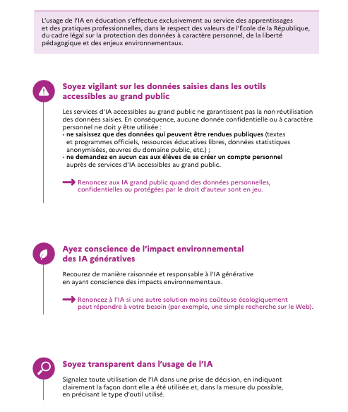 Ce document a pour objectif d’apporter des réponses claires aux interrogations légitimes de l’ensemble de la communauté éducative et des agents sur l’usage de l’IA en éducation. L’usage de l’IA est autorisé en éducation dès lors qu’il respecte le cadre ici défini. Pour accéder à la ressource, cliquez sur l’image :