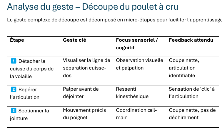 Analyse du geste – Découpe du poulet à cru Le geste complexe de découpe est décomposé en micro-étapes pour faciliter l’apprentissage :