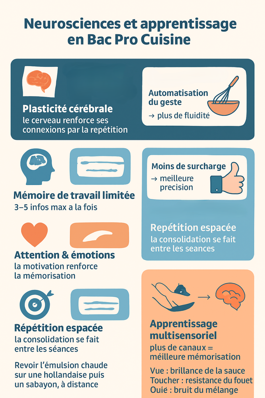 Construire la mémoire motrice : Faire reproduire le geste en micro-étapes en demandant à l’élève de verbaliser à voix haute. « Je fais, je dis » et associer vue + toucher + écoute : « Regarde l’anatomie de la volaille, sens la résistance du couteau, écoute le bruit de la lame sur les os. » Multiplier les canaux d’apprentissage : Associer geste et parole avec mise en mémoire kinesthésique et ressenti tactile.