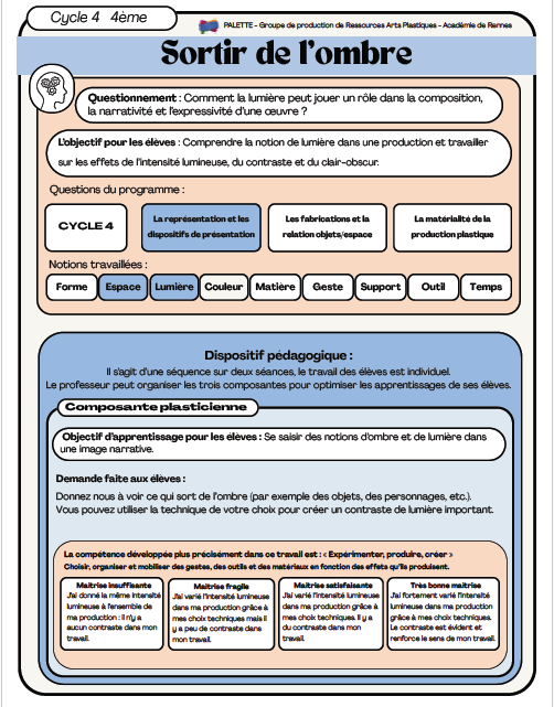 Ces documents ont été conçus par le groupe de production de ressources académique « Palette » pour permettre aux enseignants de mieux comprendre comment concevoir une séquence pédagogique en articulant les trois composantes du cours d’arts plastiques (plasticienne, culturelle et théorique) tout en évaluant des compétences du socle. Ces propositions ne constituent pas des modèles mais des outils à expérimenter, à s’approprier, à modifier…